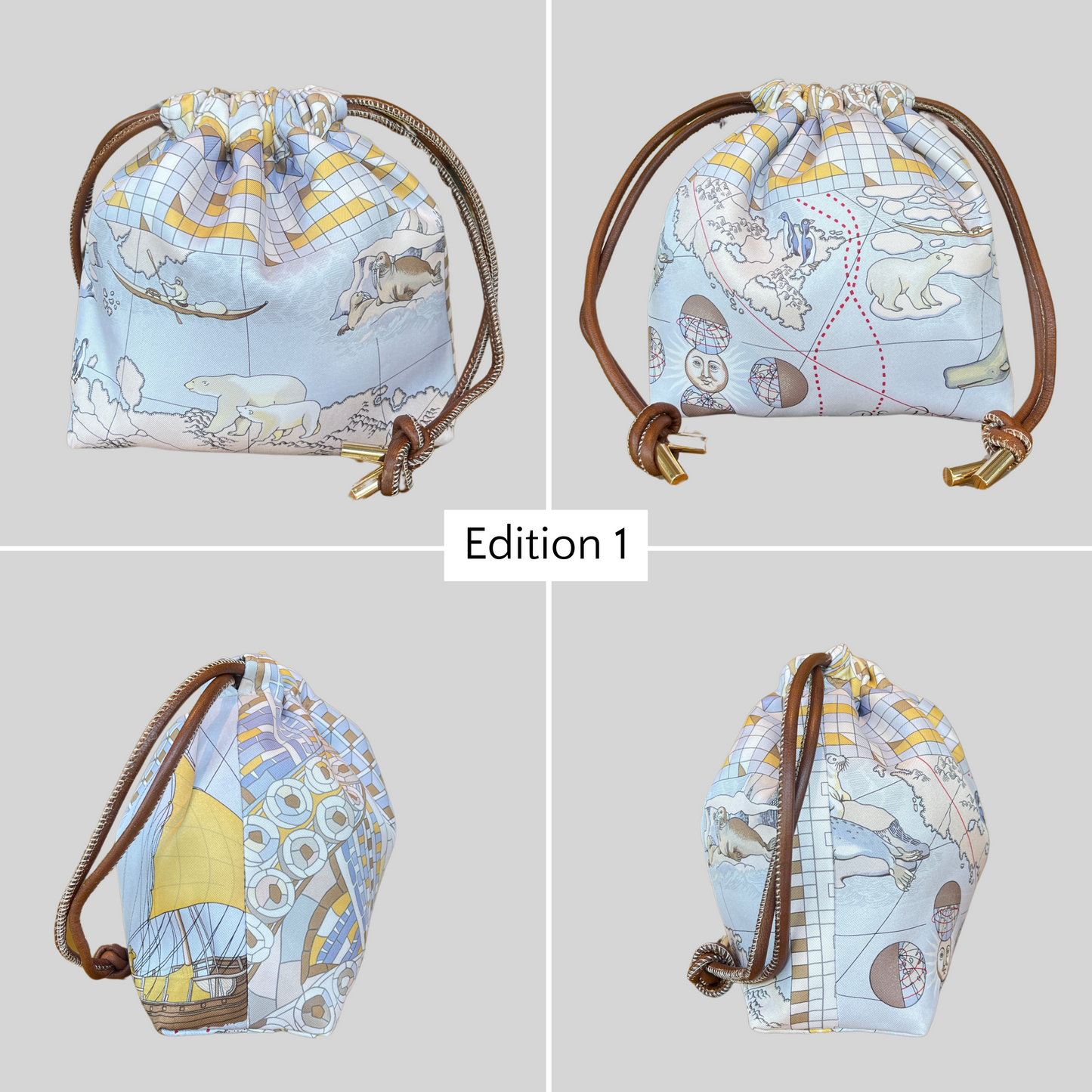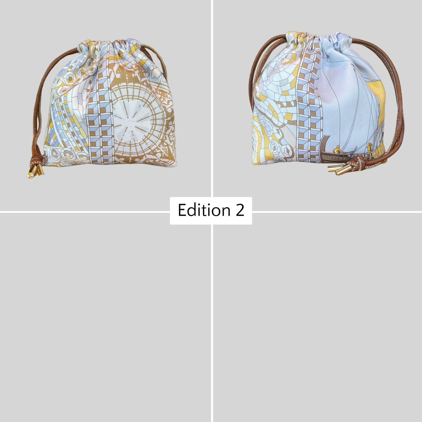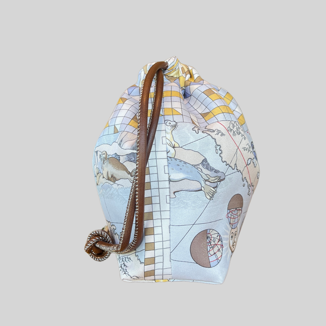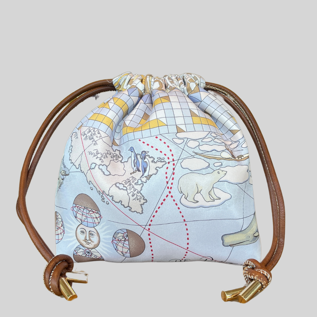 This silk Prettysac - 2 editions - is crafted from a rare vintage carré that celebrates ancient exploration, inspired by Pytheas, the Greek navigator who journeyed beyond the known world to lands of ice, stars, and mystery.