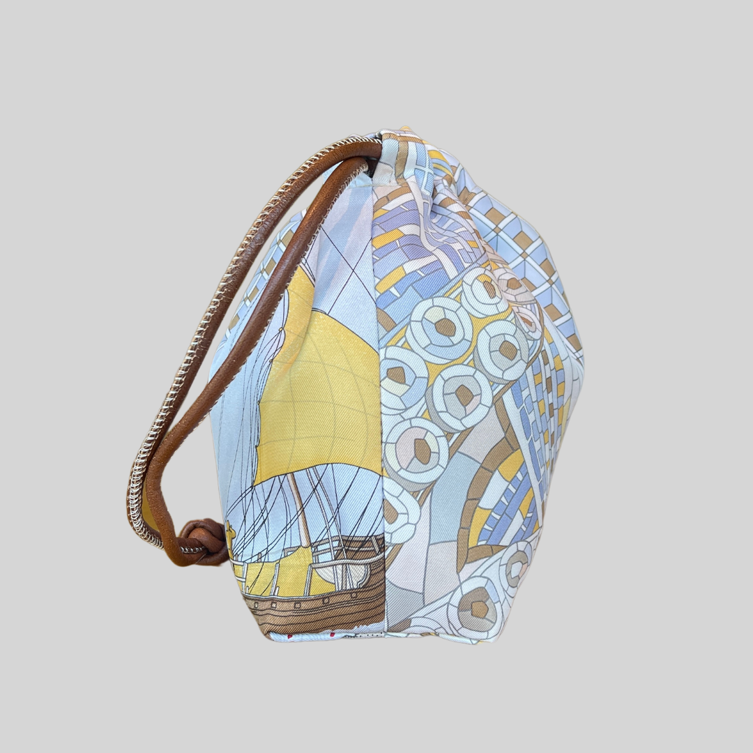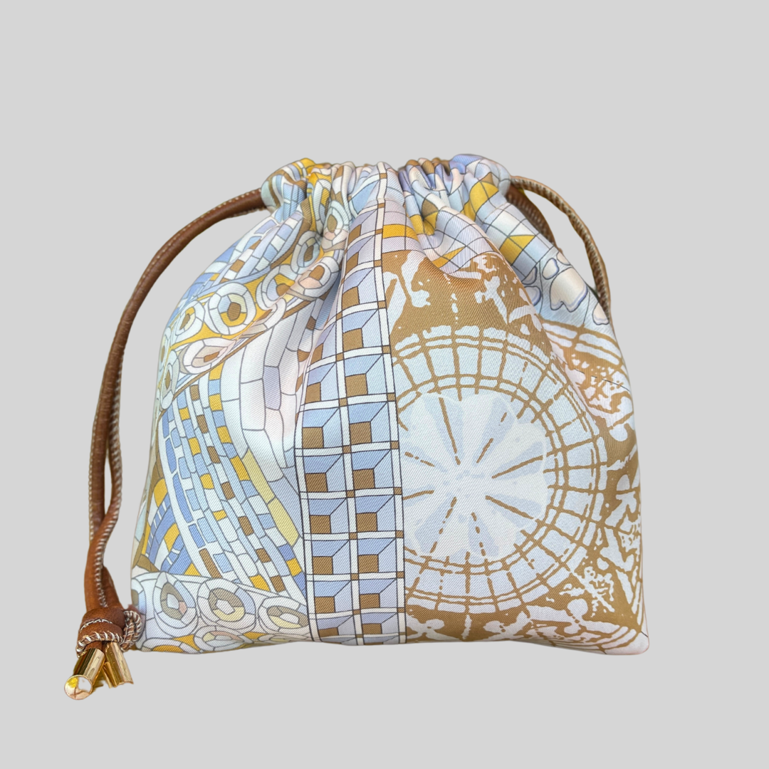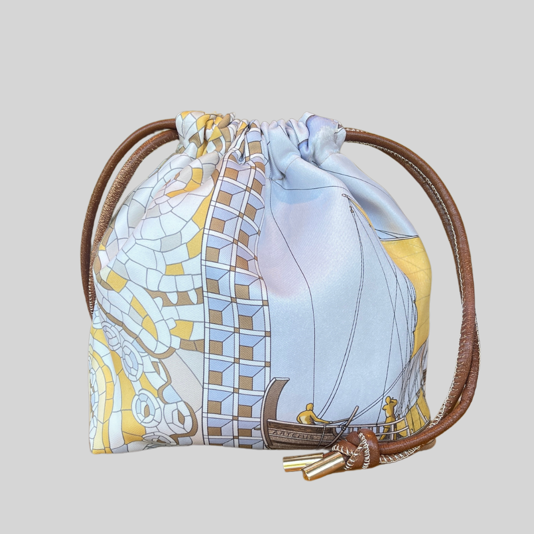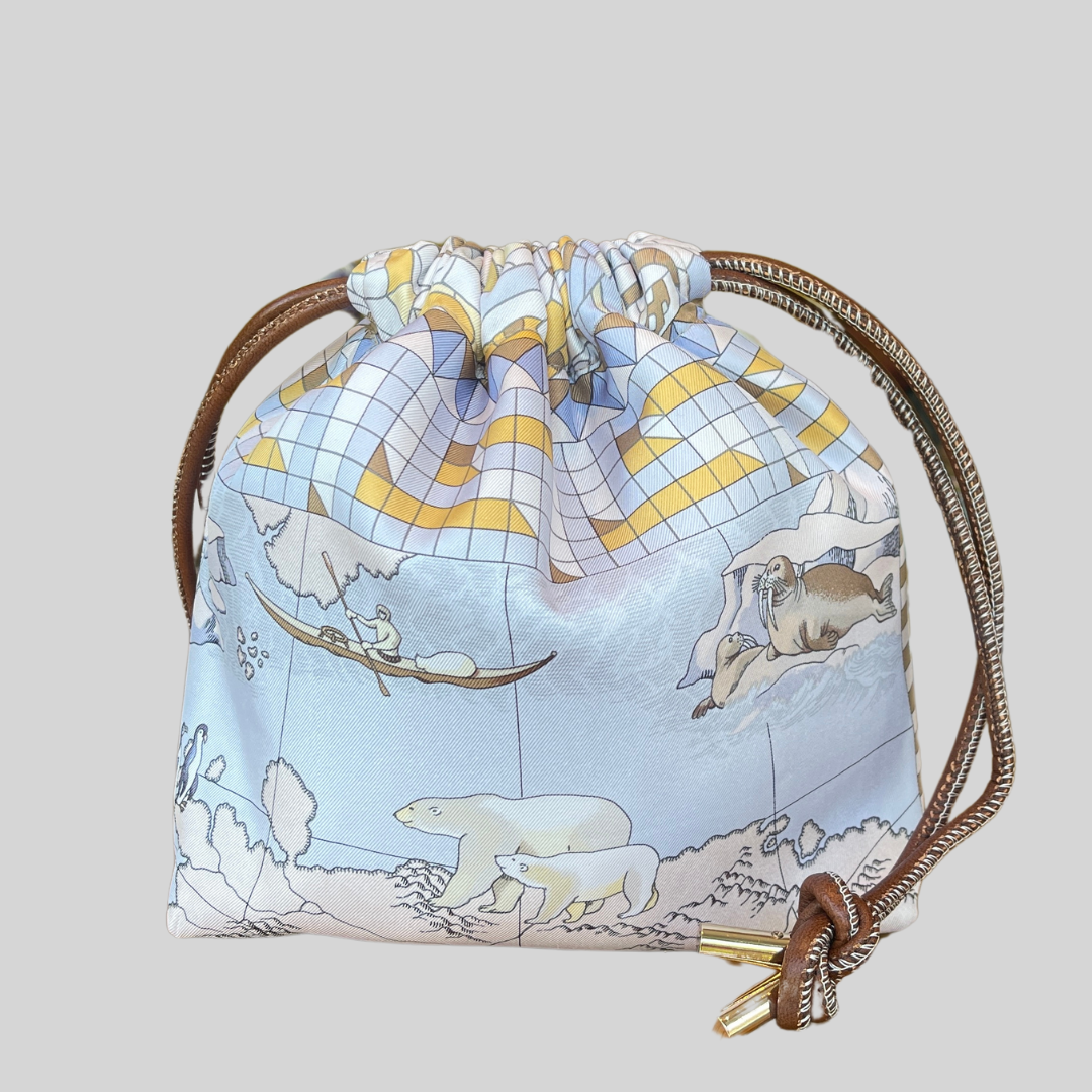 This silk Prettysac - 2 editions - is crafted from a rare vintage carré that celebrates ancient exploration, inspired by Pytheas, the Greek navigator who journeyed beyond the known world to lands of ice, stars, and mystery.